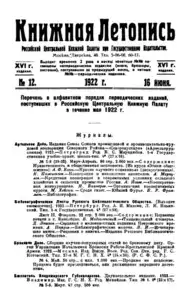 Книжная летопись Основной выпуск << < 1922 № 12 > >> |