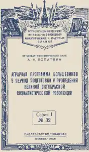 . Александр Николаевич Лопаткин Аграрная программа большевиков в период подготовки и проведения Великой Октябрьской социалистической революции Аграрная программа Коммунистической партии Советского Союза, являющаяся неразрывной, составной частью общей программы партии, определяет научные основы политики партии по отношению к сельскому хозяйству, к различным классам и группам сельского населения на отдельных этапах революции и социалистического строительства. Значение аграрной программы партии определяется прежде всего тем, какое место занимает в марксизме-ленинизме вопрос о союзе рабочего класса с крестьянством. СОДЕРЖАНИЕ: Введение (3). Аграрная программа большевиков в период подготовки социалистической революции (8). Решение аграрного вопроса Октябрьской социалистической революцией. Декрет о земле и его историческое значение (25). Углубление социалистической революции в деревне. Первые шаги социалистического строительства в сельском хозяйстве (33). . | |